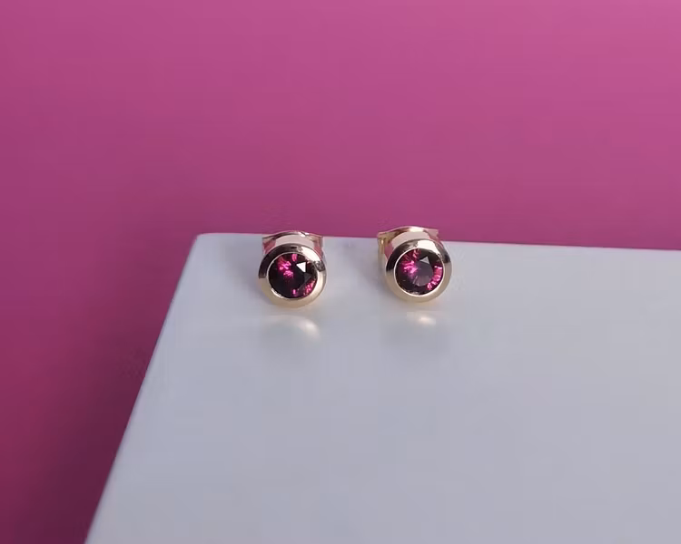 A classic solitaire earring with not-so-classic magenta garnets!