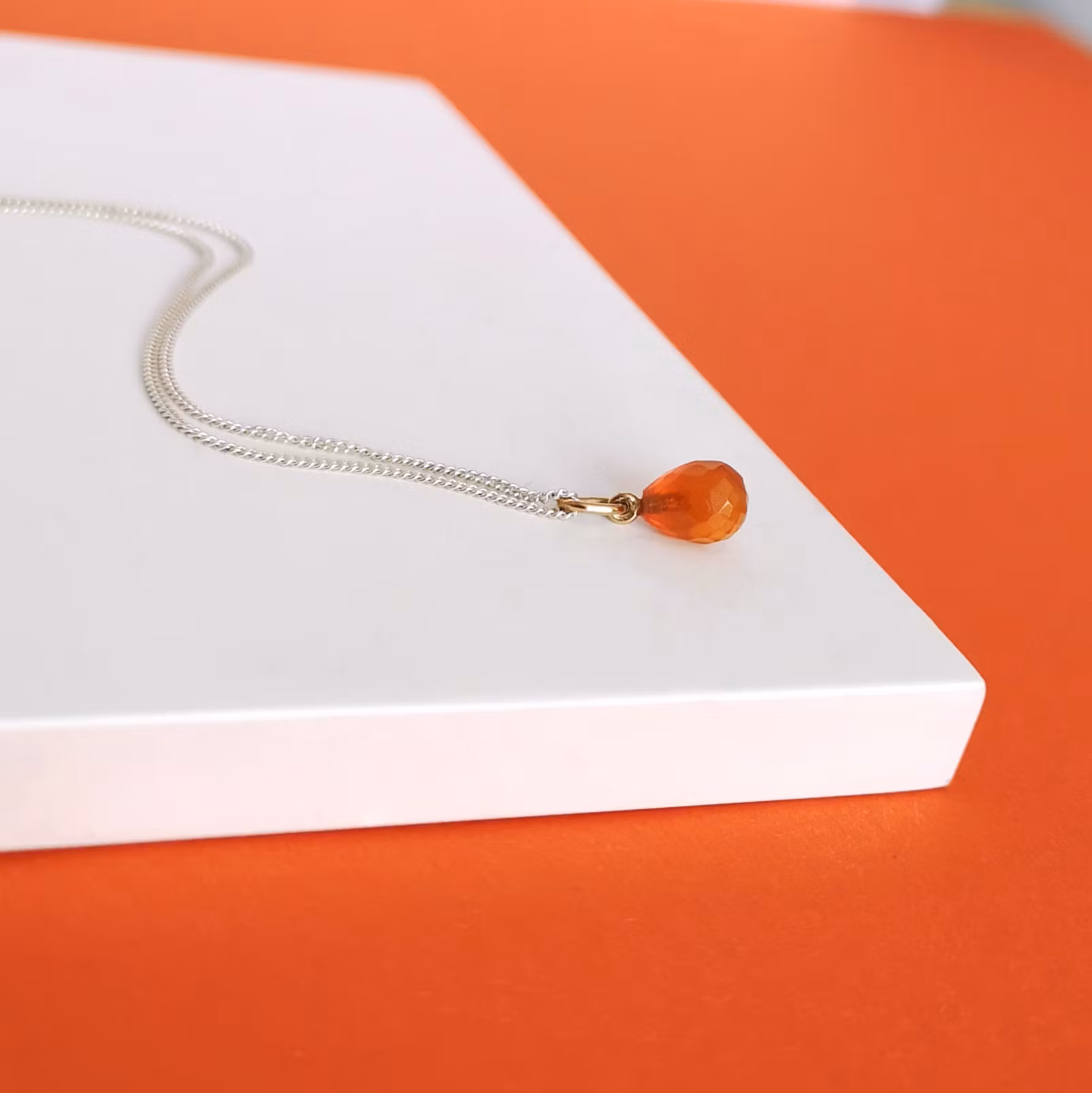 An adorable pendant with a bright, bold carnelian and 18k gold. A silver curb chain is included.